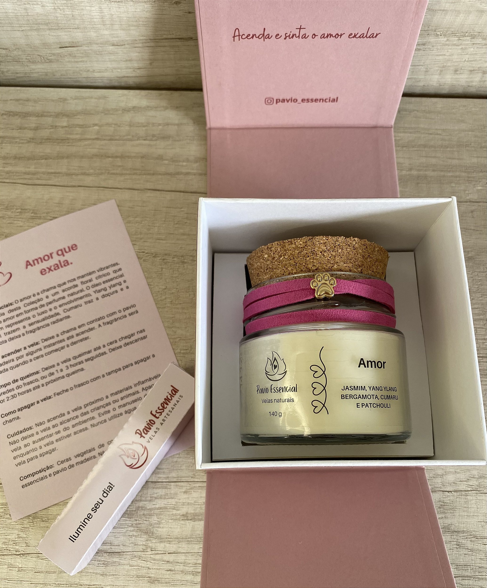 O amor é a chama que nos mantém vibrantes. A Fragrância desta Coleção é um acorde floral cítrico que transcende amor em forma de perfume natural. O óleo essencial de Jasmim representa o luxo e o envolvimento, Ylang ylang e Patchouli trazem a sensualidade, Cumaru traz a doçura e a Bergamota deixa a fragrância radiante. Quantidade: 140 g. Frasco de vidro, tampa de cortiça, cordão de couro rosa e pingente de patinha dourado. Caixa cartonada rosa com fechamento em imã. Composição: Ceras Vegetais de cera, palma e arroz, pavio de madeira e óleos essenciais Jasmim, Ylang Ylang, Bergamota, Pachoulii, Ho wood e extrato de cumaru.