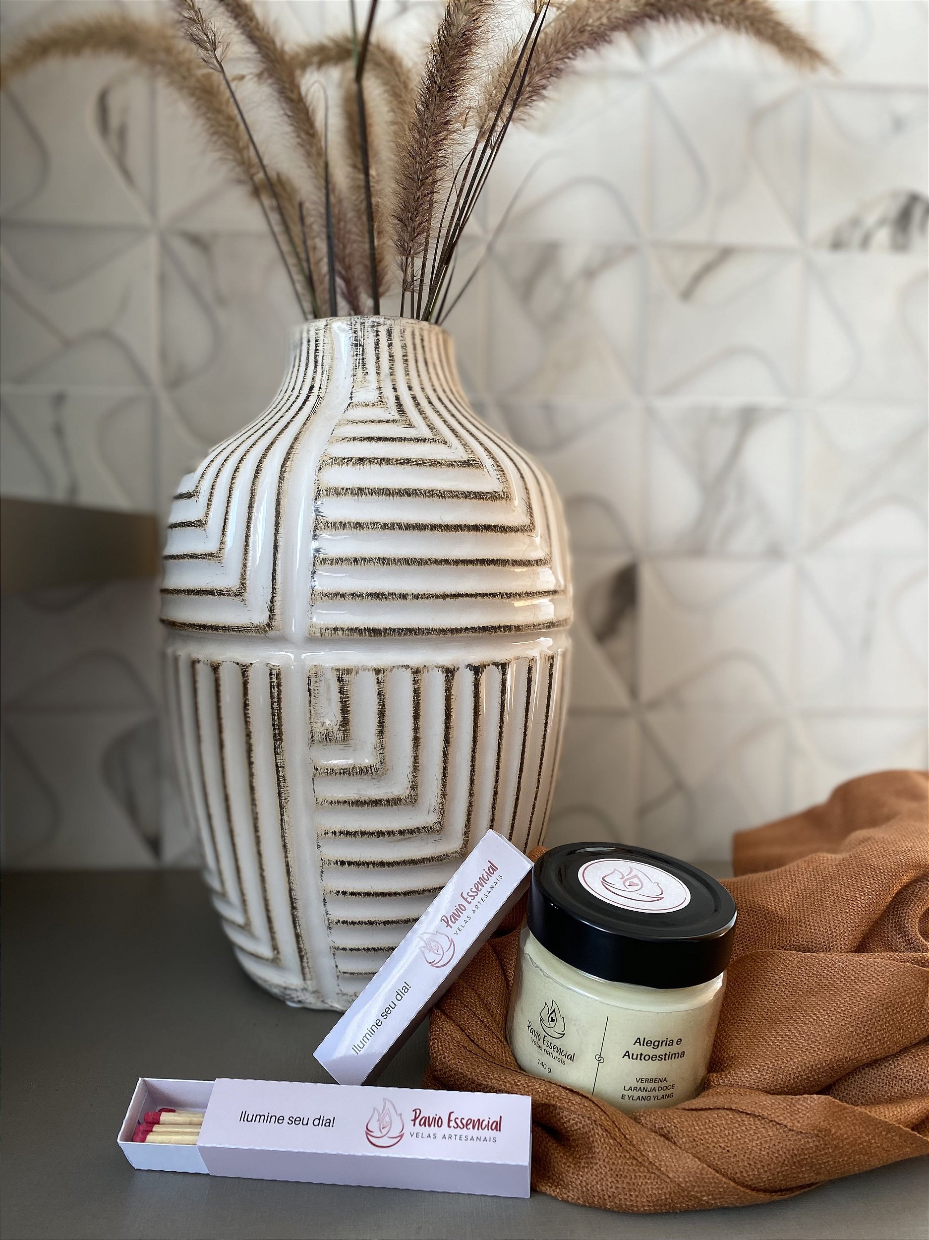 Produzida com ceras vegetais de coco, palma e arroz, óleos essenciais e pavio de madeira.