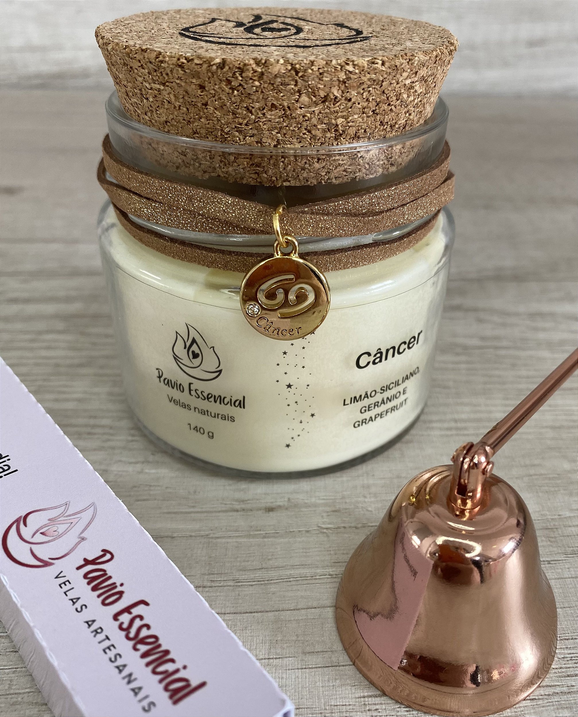 O signo de Câncer é regido pela Lua, a qual está relacionada às questões emocionais, destacando a sensibilidade. Por isso, os cancerianos são emotivos, carentes e dependentes. Costumam ter uma forte conexão com as lembranças do passado, podendo ter dificuldade em perdoar. Para Câncer, podem ser indicados os óleos essenciais de: Limão siciliano para clarear a mente, trazer foco e centramento. OE de Grapefruit para trazer harmonia e alegria. OE de Gerânio para estimular a autoestima e equilibrar a instabilidade emocional. Quantidade: 140 g. Frasco de vidro âmbar, tampa de cortiça, cordão e pingente. Composição: Ceras Vegetais de cera, palma e arroz, pavio de madeira e óleos essenciais Limão-siciliano, Grapefruit e Gerânio. Demais acessórios não acompanham a vela.